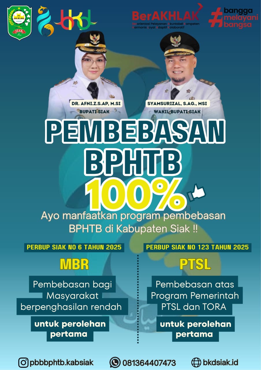 Masyarakat Kabupaten Siak diimbau untuk segera memanfaatkan kesempatan emas ini. Program pembebasan BPHTB 100% ini adalah wujud komitmen Pemerintah Kabupaten Siak untuk melayani dan menyejahterakan rakyatnya, sejalan dengan nilai-nilai BerAKHLAK (Berorientasi Pelayanan, Akuntabel, Kompeten, Harmonis, Loyal, Adaptif, dan Kolaboratif) serta semangat “bangga melayani bangsa.”