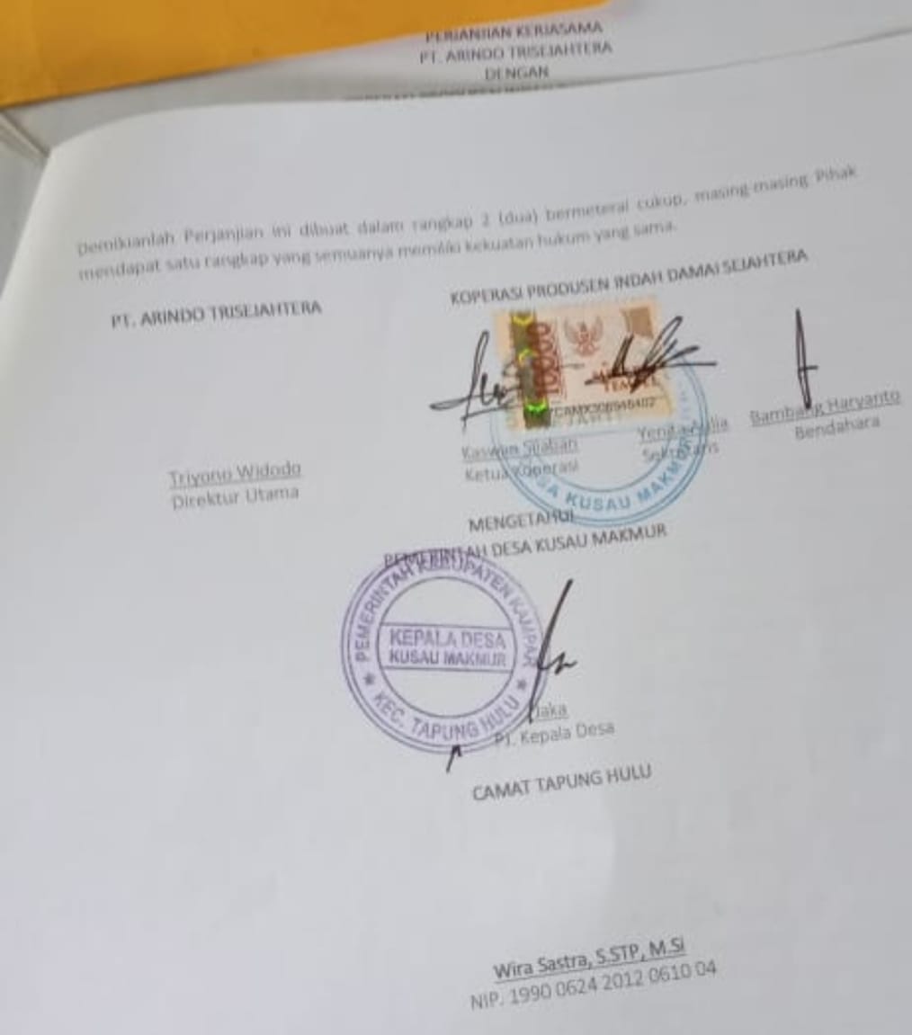 Camat Tapung Hulu Nuryadi,S.E Menyatakan, “Kita bukan tidak mau menanda tangani surat perjanjian kerjasama PT Arindo Trisejahtera dengan Koperasi Produsen Indah Damai Sejahtera tersebut. Tetapi masih ada sedikit lagi yang kurang lengkap,”Ungkapnya.