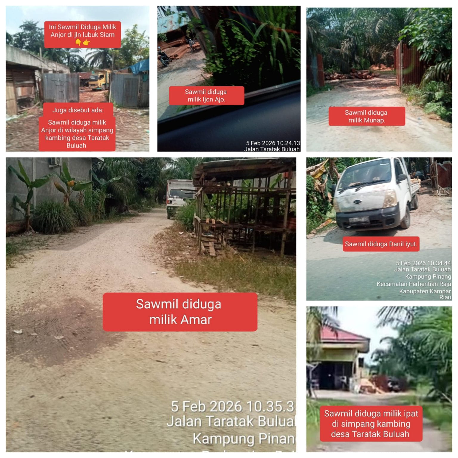 Pada Kamis, 5 Februari 2026, sejumlah sawmill kayu serta aktivitas bongkar muat kayu menggunakan mobil colt diesel kembali didokumentasikan oleh warga setempat menggunakan kamera GPS. Dokumentasi tersebut kemudian diteruskan kepada wartawan. Warga juga menyebutkan beberapa nama yang diduga sebagai pemilik sawmill di kawasan Jalan Lubuk Siam, Kecamatan Perhentian Raja, Kabupaten Kampar, di antaranya: