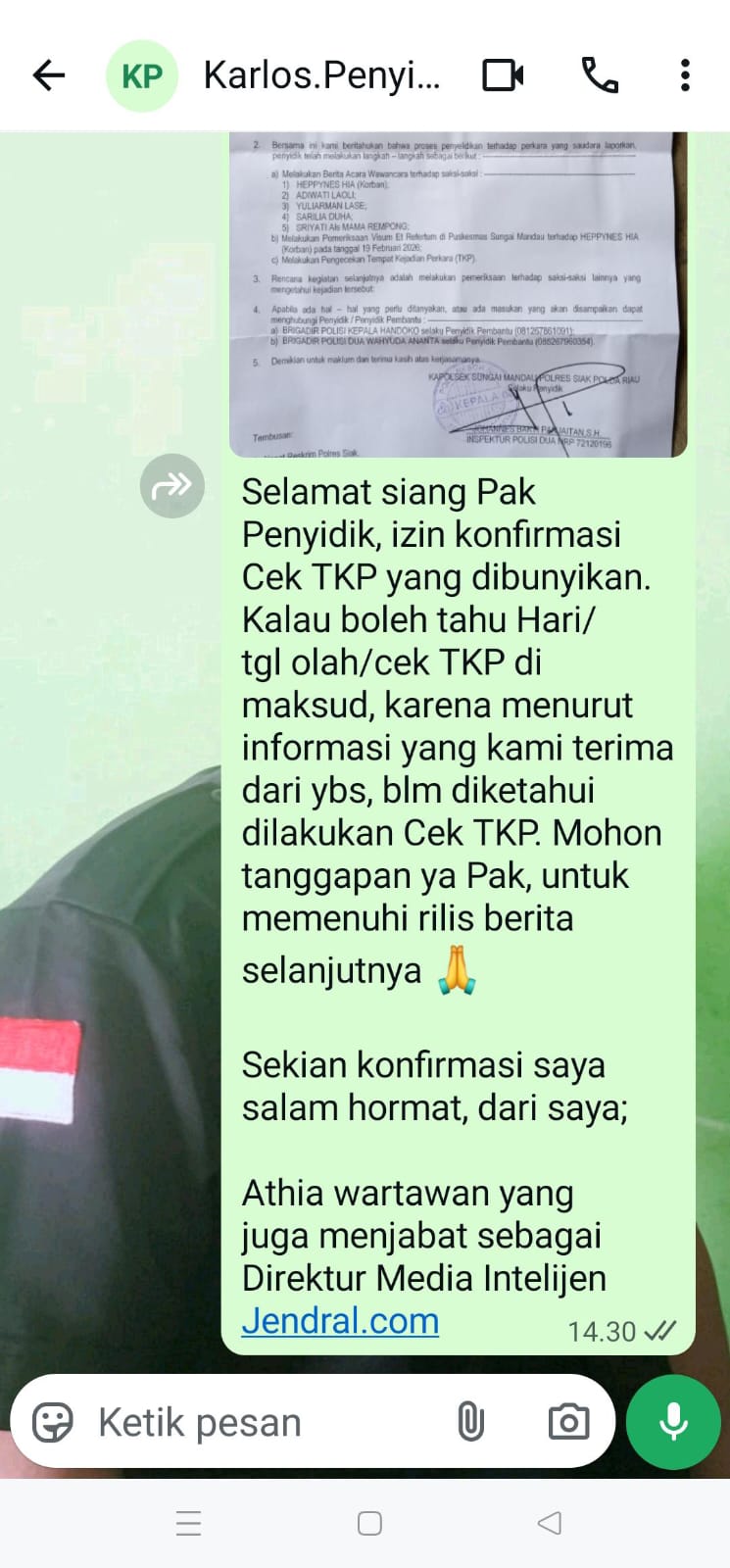 Hal ini memunculkan pertanyaan mengenai prosedur dokumentasi dan pembuktian di TKP, kehadiran saksi atau pihak terkait saat pengecekan berlangsung, serta transparansi proses penyelidikan sesuai prinsip due process of law. Penanganan perkara pidana, menurut pelapor, seharusnya menjunjung tinggi profesionalitas, akuntabilitas, dan keterbukaan.