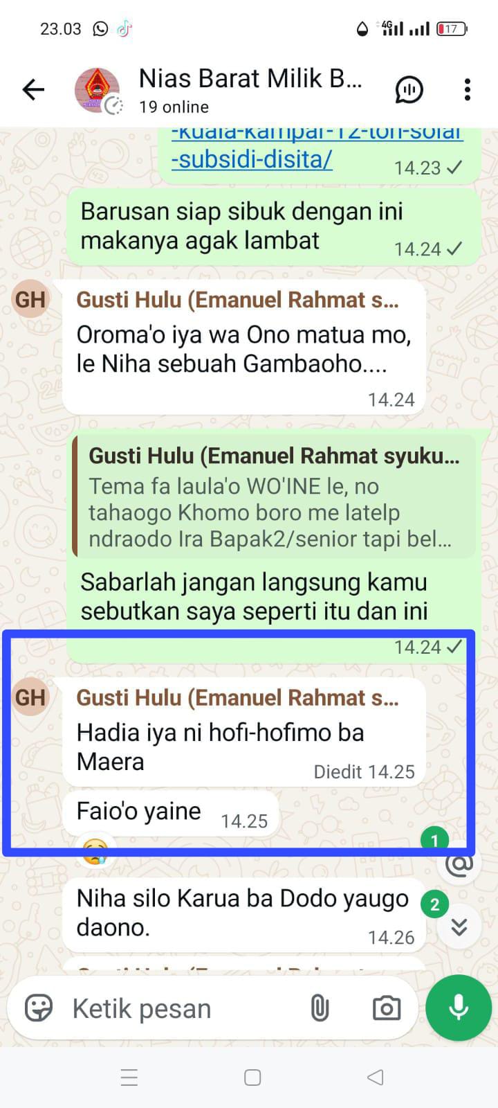 Selain itu, dalam percakapan grup tersebut, juga terdapat keterlibatan pihak lain yang diduga memiliki hubungan kekerabatan dengan Emanuel Hulu, yang turut memperkeruh suasana dengan pernyataan yang bersifat merendahkan dan memancing konflik.